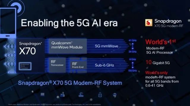 不久前,高通在MWC 2022世界移动通讯大会上正式推出了骁龙X70,这是高通旗下第五代5G调制解调器及射频系统,同时也是全球唯一支持从600MHz到41GHz全部5G商用频段,且首个集成了5G AI处理器的基带芯片。