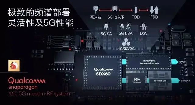 在5G大规模商用的同一年,高通又推出了第三代5G解决方案——骁龙X60,这是全球第一块基于5nm制程的5G芯片,同时也是首个支持5G毫米波和6GHz以下频段聚合的5G芯片。