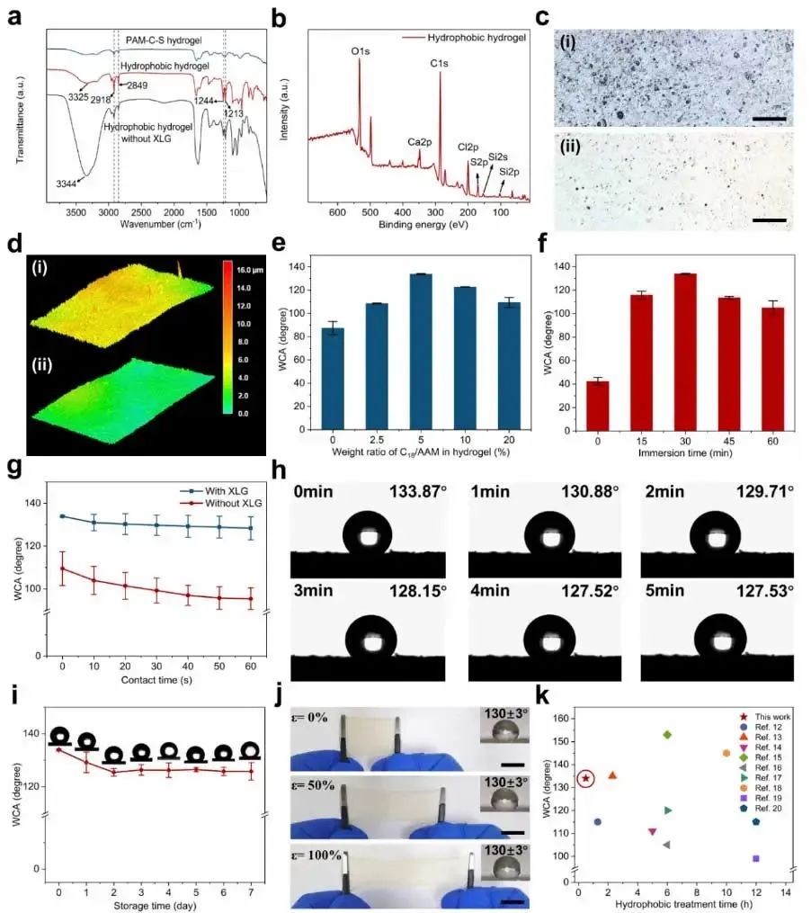 分别通过FTIR, XPS以及激光共聚焦显微镜对疏水层进行了材料表征,并进一步测量疏水接触角,验证了XLG和Ca2+诱导疏水基重排和提高表面粗糙度的协同作用,从而实现半小时处理得到133.87度疏水接触角。在耐久性测试和拉伸性测试中,该水凝胶显示出了优异的疏水性能。