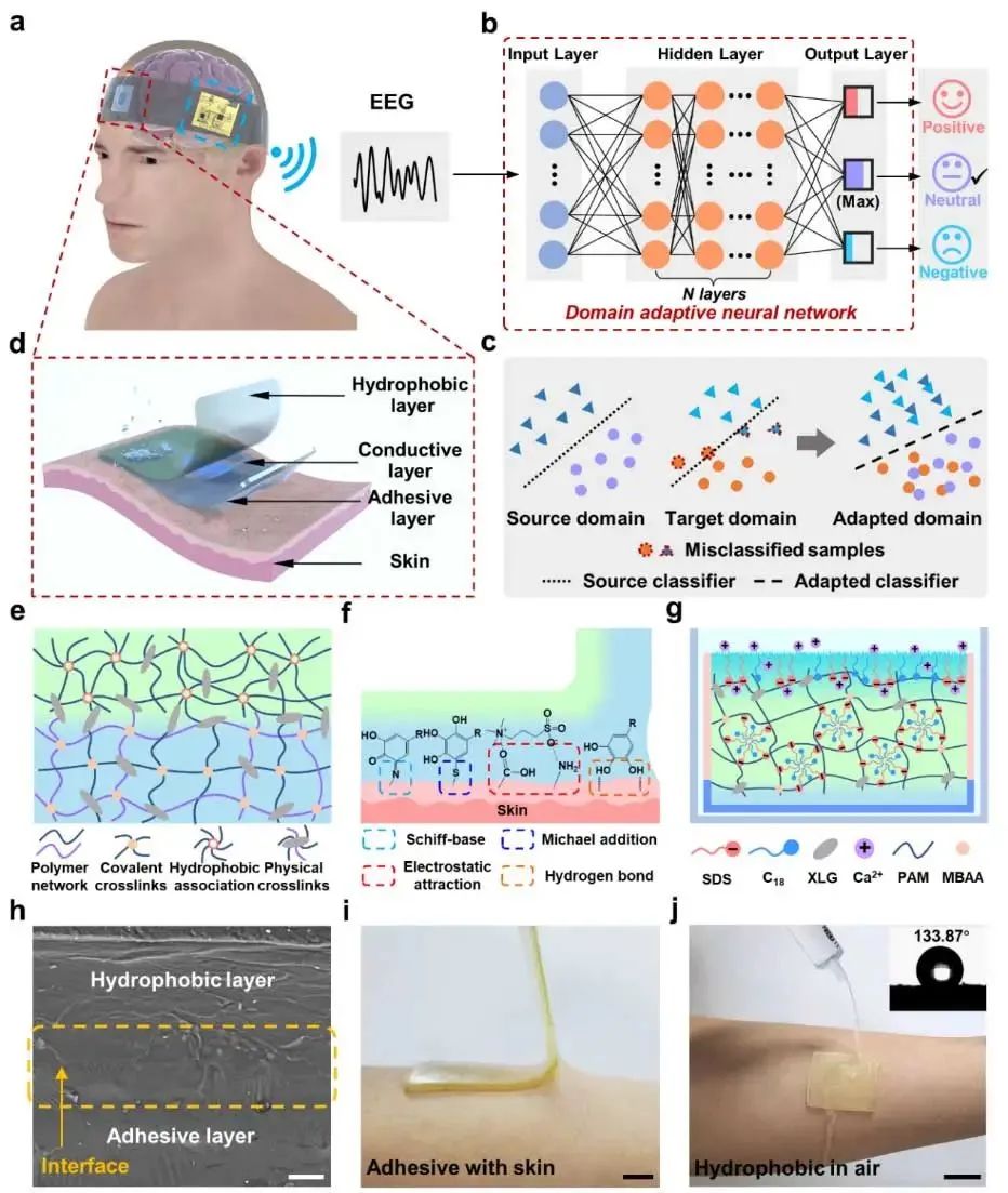 在AHBH-ECC电极中,主要包含疏水层,ECC导电层与粘性层,其中通过黏性修饰和疏水诱导,该双层AHBH水凝胶具有优异粘性和疏水性;疏水层能有效抵抗外界水渍干扰,粘性层保证了电极与皮肤保形接触,进一步将疏水自黏水凝胶表皮电极与无线蓝牙模块集成到便携式头带中采集脑电信号,结合DANN迁移学习算法实现情绪识别。