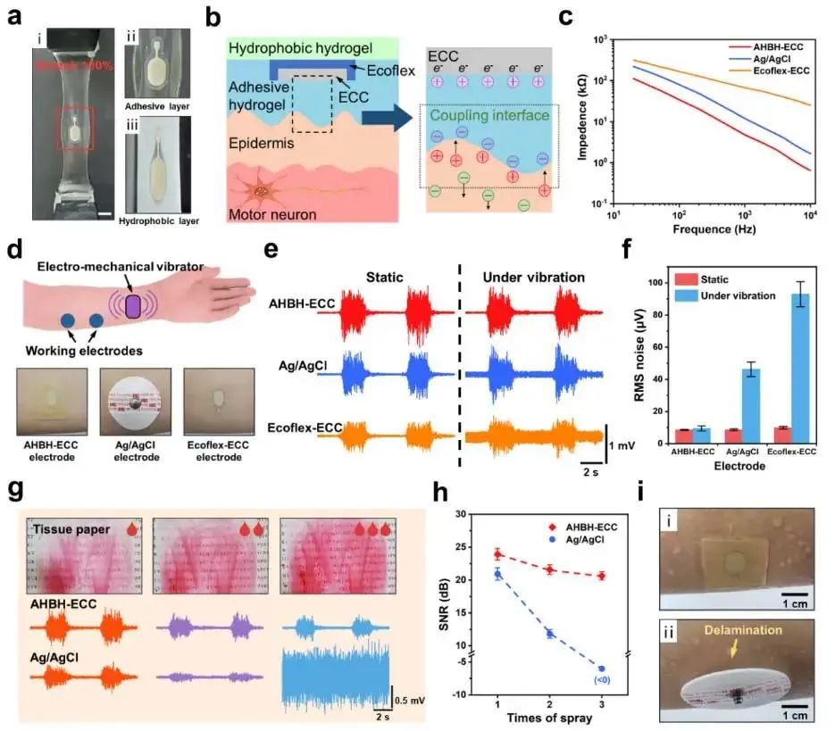 相比于传统的Ag/AgCl电极,AHBH-ECC表皮电极具有更低的接触阻抗。在振动和出汗测试中,AHBH表皮电极具有更高的抗运动伪影能力,采集的电生理信号信噪比更高。