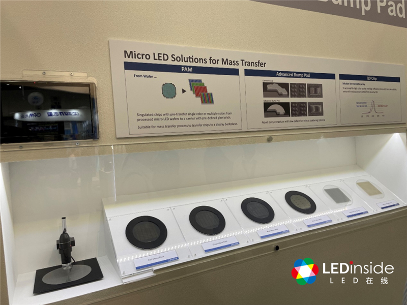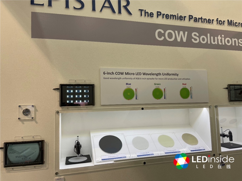 富采携手友达、群创于苗栗投资100亿新台币 Micro LED计划,瞄准显屏、电视、AR。因此会场可见到6英寸与8英寸Micro LED做完芯片制程的晶圆片(Chip on Wafer;COW),针对于不同应用,可采用6英寸GaN on Sapphire或是8英寸GaN on Si晶圆片制程。