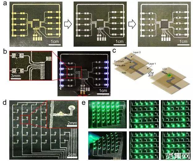采用上述制造原理,研究小组制成了一系列柔性和可拉伸功能电路(图2),如多层电路、大面积电路(图3)以及可拉伸传感器(图4)等,试验展示出各相应器件优良的电学稳定性、适应性及可回收优点。文中所建立方法的实施无需复杂设备,制造出的柔性电路可用于穿戴式医疗设备,这为个性化医疗电子的实现提供了全新途径。
