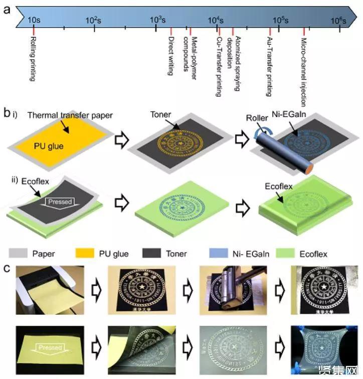 在液态金属柔性电子领域有着十余年研究经验的刘静小组,基于前期对液态金属材料大量特性的研究发现,在室温下呈液态的镓基合金与固体金属微粒(Ni)的混合可制备出具有高粘度、可塑性的半液态金属材料(Ni-EGaIn)。此类材料在不同基底表面上的黏附性存在巨大差异,利用这种差异性可快速印制出图案化液态金属电路。实验证实,半液态金属材料在PU胶膜上具有极高粘附性,而在碳粉上则粘附性较差。为此,研究小组首先引入激光打印方法将碳粉图案沉积到涂覆有PU胶膜的纸张上,再借助半液态金属材料在两类基底上粘附性的显著差异,通过滚动涂覆方式,在极短时间内(<10s)即将半液态金属材料选择性印制到A4大小纸张上的目标部位,可以说瞬间制出所需电路(图1)。利用该技术制备的柔性电路,最高精度已达50微米,且在基底弯曲折叠过程中仍能保持电路连接的稳定性。研究进一步指出,新方法较具普适性,半液态金属材料在更多基底材料如柔性硅胶(Ecoflex)表面也具有较高粘附性。基于此现象,同样可利用转印方式将半液态金属墨水材料沉积到柔性硅胶表面的目标部位,由此快速制备出可拉伸柔性电路。
