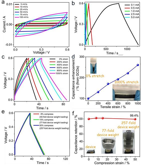 研究团队对PAM-VSNPs基电容器不同拉伸应变条件下循环伏安(CV)曲线、恒电流充/放电曲线(GCD)进行了系统的测试,测试表明随着拉伸率的增加其电化学性能得到了提升。在1000%拉伸应变条件下GCD和CV曲线推算其电容分别增加了2.6倍和2.2倍。