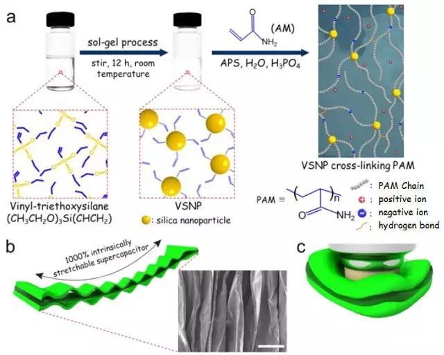 研究团队以乙烯基三乙氧基硅烷为原料,通过溶胶-凝胶法制备了粒径为10 nm的VSNPs,然后与丙烯酰胺单体原位聚合制备了具有VSNPs作交联点的水凝胶电解质。该水凝胶体系中共价键连接的VSNPs交联点在大拉伸应力条件下能够起到应力耗散的作用,提高了体系的柔韧性。体系中PAM链结构中分子间/分子内的可逆氢键能够保持凝胶体系的完整性。凝胶体系中的质子则保证了水凝胶体系的高离子电导率。上述三者的协同效应共同赋予PAM-VSNPs水凝胶电解质优异的柔韧性(耐高拉伸应变、可压缩)和电化学性质,其离子电导率为17 mS cm-1与PVA/H3PO4电解质体系性能相当。研究团队通过将PAM-VSNPs电解质膜水凝胶预拉伸(ε >1000%),贴合柔性的PPy@CNT纸基电极后释放预应变,得到了表面具有“褶皱”结构的柔性电容器。