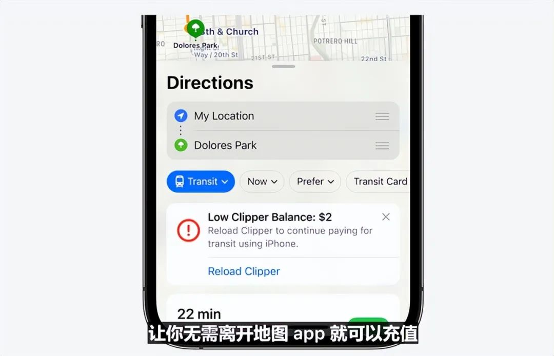 iOS 16上的地图也进行了相对应的升级,其地图可以增加到多个途径地点的规划,最多规划可达15个地点。并且在iOS 16上的地图中,如果用户选择以公共交通方式出行,地图会进行更加精确的费用预估,并且将交通卡余额进行显示,如果交通卡余额不足,用户可以直接在地图内进行充值,无需二次跳转。地图方面的更新也将带入iPad OS上。