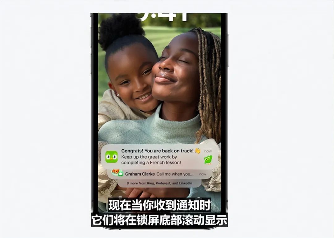由于苹果在iOS 16上对于锁屏界面进行了个性化的大改,因此在iOS 16上锁屏界面的通知将被放置在屏幕的下方,用户可以通过滚动通知消息来查看一系列的内容。