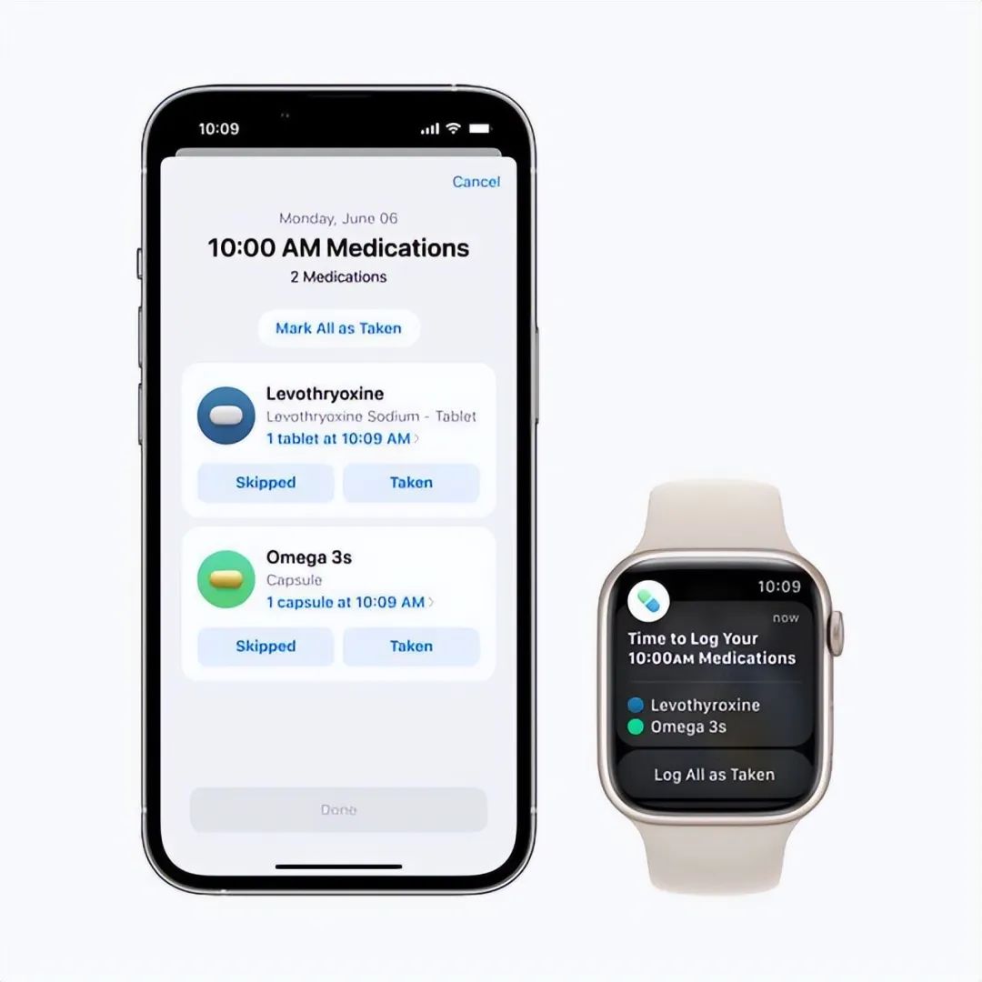 随着苹果watchOS 9推出的,还有全新的用药管理功能,用户可以在苹果的iPhone以及Apple Watch设备上设置、同步用药情况,并且对于家庭成员进行用药方面的提醒,制定用药计划等。而用药管理这一功能如果在美国地区使用,如果用户添加至健康 App 的药物之间可能会产生严重的相互作用,用户就会收到一条提醒,避免错误用药。