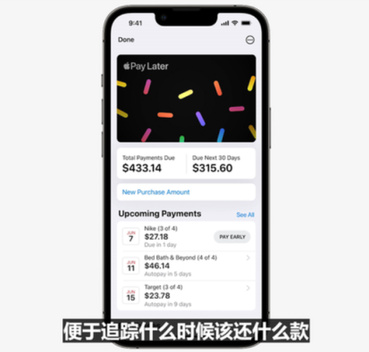iOS 16上的钱包功能也进行了更新,苹果宣称其将致力于打造无实体钱包的世界。iOS 16的钱包功能在原先支持众多钥匙、卡等内容的基础上,进一步提升了分享的可用性,用户可以将钱包内保存的钥匙进行快速分享,让其他用户进行使用。并且苹果还针对于钱包以及Apple Pay功能,推出了全新的 Apple Pay Later 的分期付款方案。借助这一服务,用户可以将一次购物行为分成四次等额的款项进行延期支付,最长可获六周免息。iOS 16