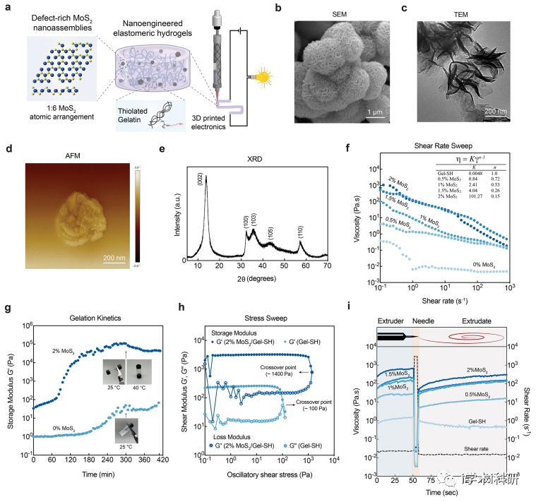 1. 展示了一种简单的策略,通过将富含缺陷的MoS2纳米组件与硫醇化明胶(Gel-SH)相结合,设计出具有高度弹性、剪切稀化、3D打印的水凝胶结构,并具有可调整的电子、离子和电容反应。