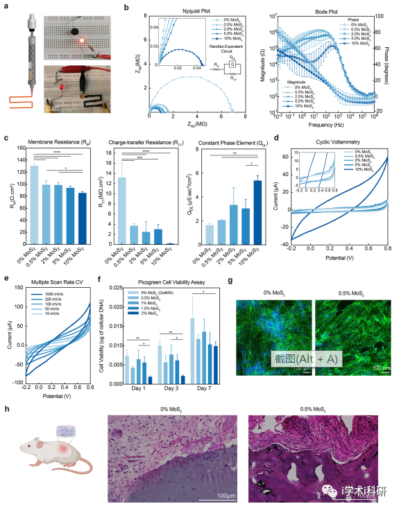 Figure 4. Electrochemical characterization and in vitro and in vivo cytocompatibility of MoS2/Gel-SH hydrogels.