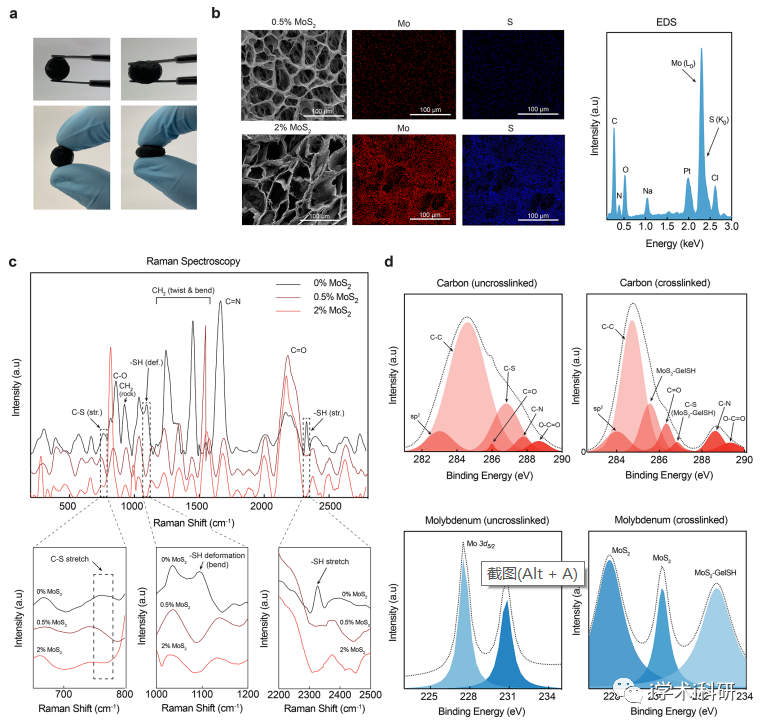 Figure 2. Chemical characterization of cross-linked MoS2/Gel-SH hydrogels investigating hydrogel architecture and conforming defect-driven gelation.