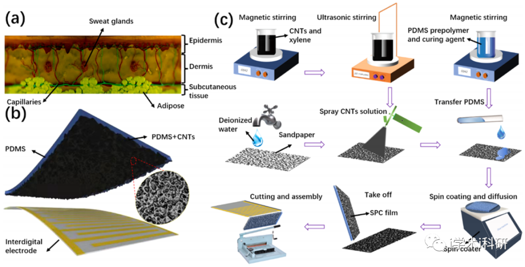 1. 受人体真皮结构的启发,基于砂纸形态和PDMS/CNTs (SPC),提出了一种结合喷涂、旋涂和扩散的工艺,可以大规模生产,用PDMS成功复制了砂纸表面的凹凸微结构,并将碳纳米管纳入微结构表面。