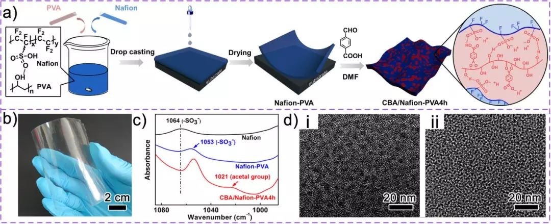 有鉴于此,吉林大学超分子结构与材料国家重点实验室的孙俊奇教授课题组将Nafion和聚乙烯醇(PVA)形成的氢键复合物膜通过后浸泡的方式修饰上对醛基苯甲酸(CBA)分子,从而制备了可修复机械损伤并恢复自身原有质子传导率、甲醇阻隔能力及电池性能的本征型自修复质子交换膜。