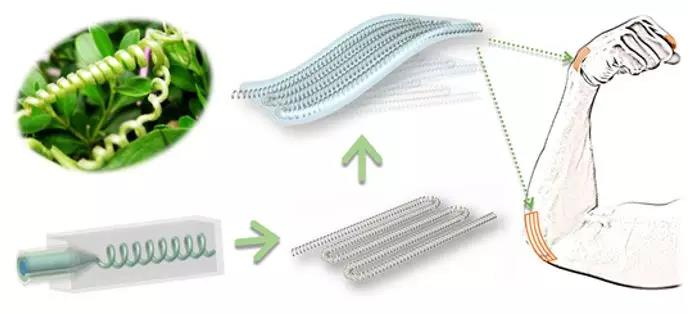 随着可穿戴设备的兴起和普及,研究人员对柔性电子的研究不断深入。其中,柔软、可拉伸的导体就像血管网络一样能够在整个柔性电子器件中传导电子,是柔性电子的重要组成部分。受自然界中植物螺旋藤蔓的启发,东南大学赵远锦团队基于微流控纺丝系统,一步制备出包裹离子液体的仿生螺旋藤蔓微导线。这种柔软的微导线经过进一步的排列可以包裹在柔性薄膜中,如皮肤般贴附在人体表面,可在不同部位不同幅度的运动中依然保持较为稳定的导电性。