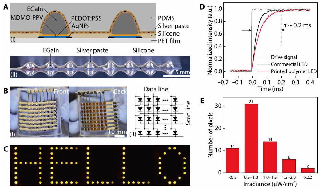 OLED显示屏的功能组件由6层组成,3D打印在聚对苯二甲酸乙二醇酯(PET)柔性薄膜上(图1A)。从下到上包括:(i)底部互连印刷银纳米颗粒(AgNP)油墨;(ii)导电聚合物聚(3,4-乙烯二氧噻吩)聚苯乙烯磺酸盐(PEDOT:PSS)的薄膜阵列;(iii)电致发光聚合物聚(2-甲氧基-5-(3,7 -二甲基氧基)-1,4-苯基乙烯炔)(MDMO-PPV)的薄膜阵列;(v)一列共晶镓铟(EGaIn)液滴以及(vi)顶部互连阵列与EGaIn阵列紧密连接,以完成终端接触垫。最后,将器件封装在挤压打印硅胶模具中的聚二甲基硅氧烷(PDMS)中,交联后形成柔韧透明的顶层。