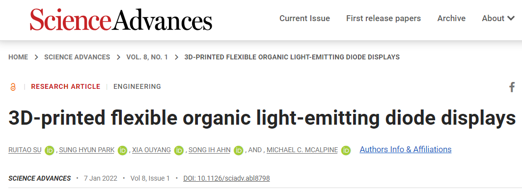 《Science》子刊:全3D打印柔性有机发光二极管显示器!被Nature亮点报道