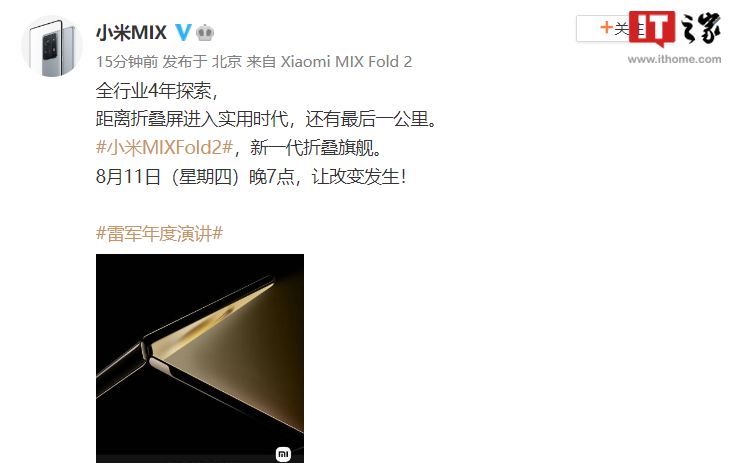 小米官宣 MIX Fold 2 新一代折叠屏手机,8 月 11 日将正式发布