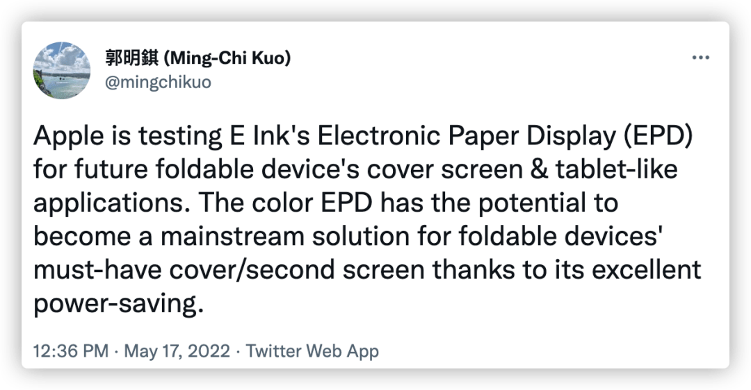 根据苹果爆料达人郭明錤的最新推特显示,苹果正在测试 E-lnk 电子纸显示屏(EPD),并计划应用于未来的可折叠设备。