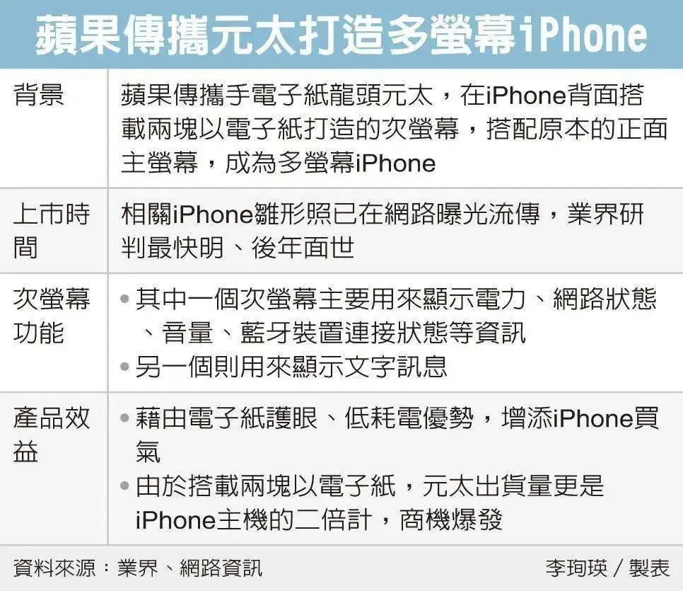 这一消息并非空穴来风,此前经济日报就曾报道,苹果将与电子纸制造商元太合作,推出带有副屏的「双屏」iPhone。