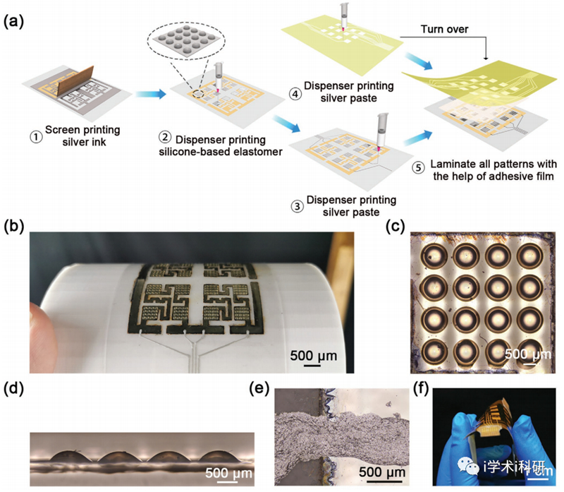 Figure 2. a) Flow chart of fabrication processes using printing technologies. b) Photo of patterns after fabrication step 3, which was attached onto a cylinder (diameter: 8 cm). c) Top- and d) side-view of confocal scanning laser microscopy images of printed elastomers. e) Confocal scanning laser microscopy image of connecting point between silver paste wire and electrode on the bottom electrode layer. f) Photo of the fabricated sensor sheet.