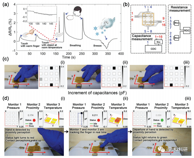 1. 提出了一种可以完全通过印刷技术制造的三模态传感器片。它集成了4x4个压力传感器单元、2x2个温度传感器单元和1个接近传感器单元。2. 该装置具有多种传感功能,而无需复杂的结构或制造工艺。