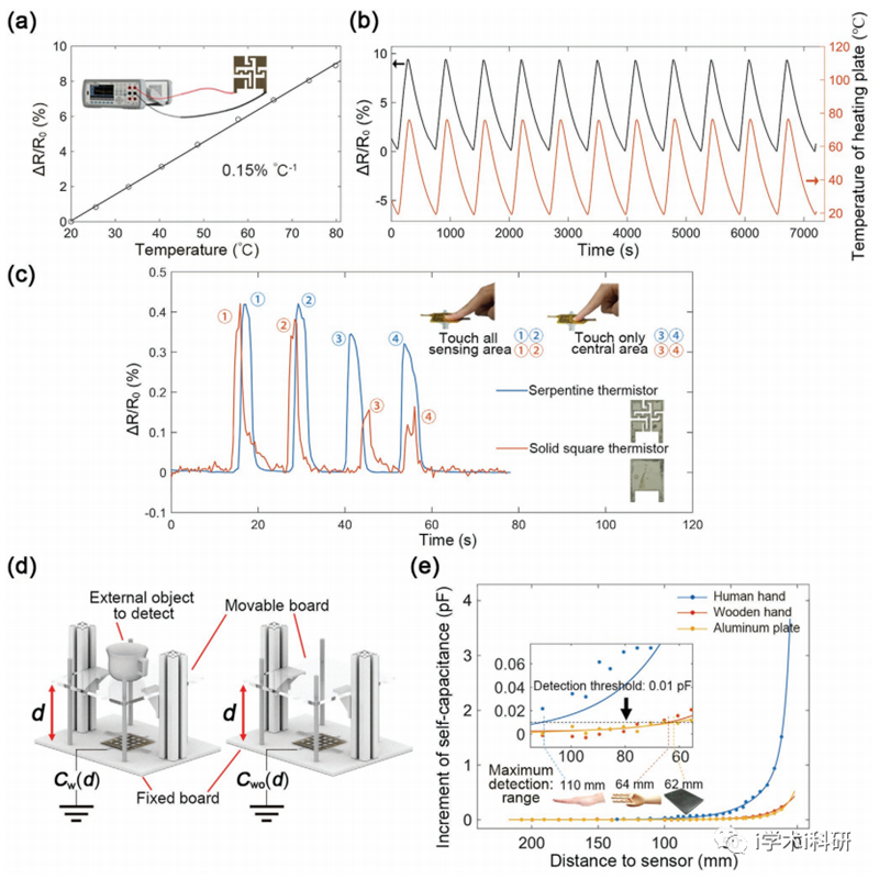 Figure 4. Proximity and temperature sensing performance of the fully printed trimodal sensor sheet.