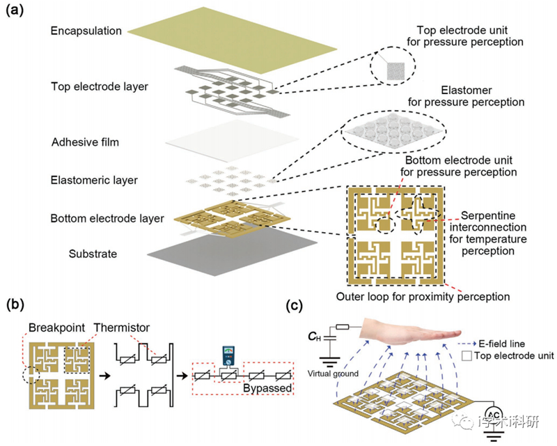 综上所述,作者开发了一种灵活的多模态传感器片,与全打印制造兼容。稳定的和同步的压力-温度-接近感知被实现了,并且具有不可察觉的干扰。精心设计的BEL结构作为所有三种感知的构件,扩展了该传感器片的功能,同时保持了简易的制造和紧凑的配置。双模式检测,一个接触和非接触感知的组合,被证明可以简化接触传感器的测量工作,从而节省了大多数传感器单元的连续操作和低效的能源消耗。此外,上述性能并不归因于特定材料的特殊性能,这表明所提出的传感器结构作为一种通用的解决方案可以通过先进的材料进一步扩展。很少有工作具有三个或更多的独立功能,而且仍然需要复杂的制造工艺。因此,易于制造和高度集成的多模态传感器片有可能成为实现低成本宏观柔性电子系统的一个有前途的途径。