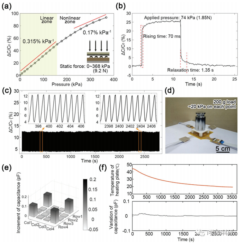 Figure 3. Pressure sensing performance of the fully printed trimodal sensor sheet.