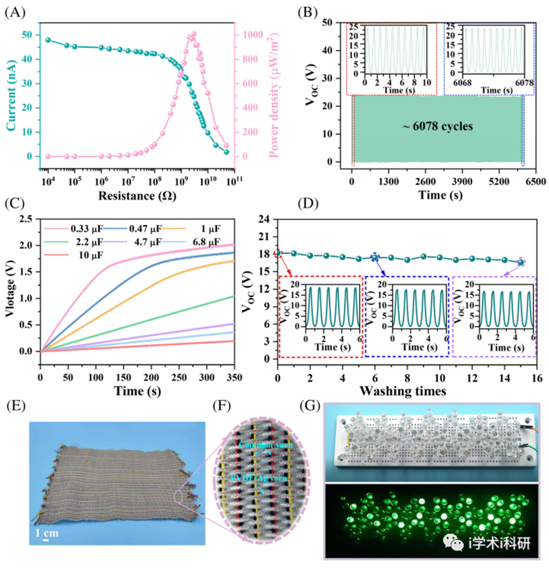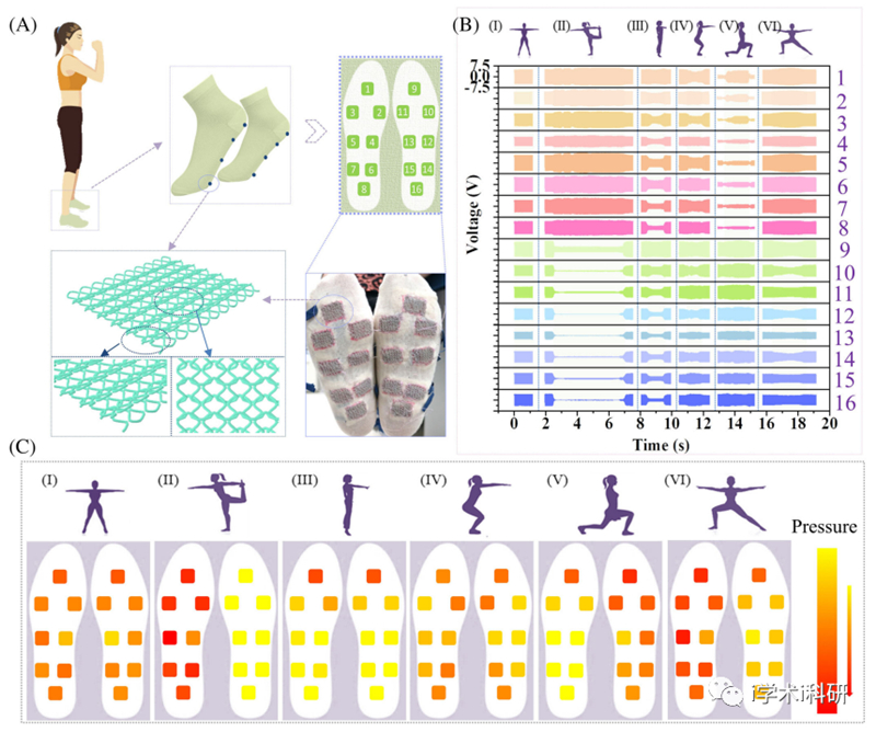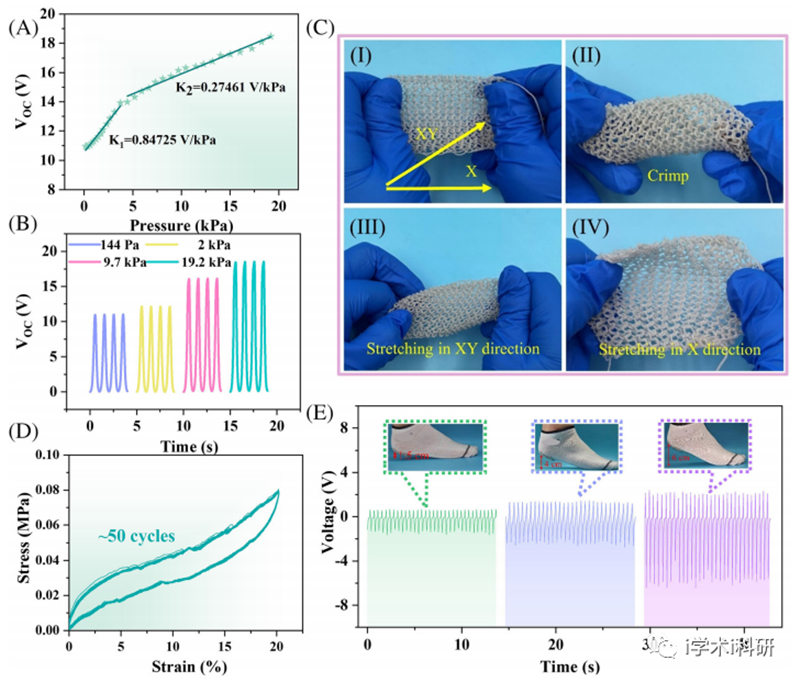 综上所述,芯壳式摩擦电编织纤维的制备方法简单、连续、均匀,适合大规模工业生产。芯壳式摩擦电编织纤维是以八根轴向缠绕的纱线(PVDF 纱线)为外壳,以一根导电纱线(镀银尼龙纱线)为芯材,在此基础上制作而成。此外它被进一步制备成具有可水洗、可变形、可透气和舒适的编织结构的动力纺织品。织造动力纺织品表现出高电输出(VOC为26 V,QSC 为8.5 nC, ISC 为129 nA (3Hz)),可以点亮约116个LED。编织动力纺织品表现出稳定的拉伸强度(大约50个拉伸周期)、机械变形和高灵敏度。此外,以针织动力纺织品为传感单元的智能袜被用于不同人体姿势的足底压力测绘,显示了可穿戴智能纺织品的广阔前景。