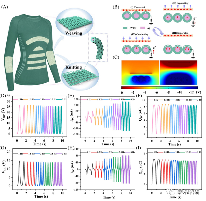 FIGURE 2 Structural characteristic, operational principle, and output performance of the core-shell triboelectric braided fibers integrating on weaving and knitting power textiles.