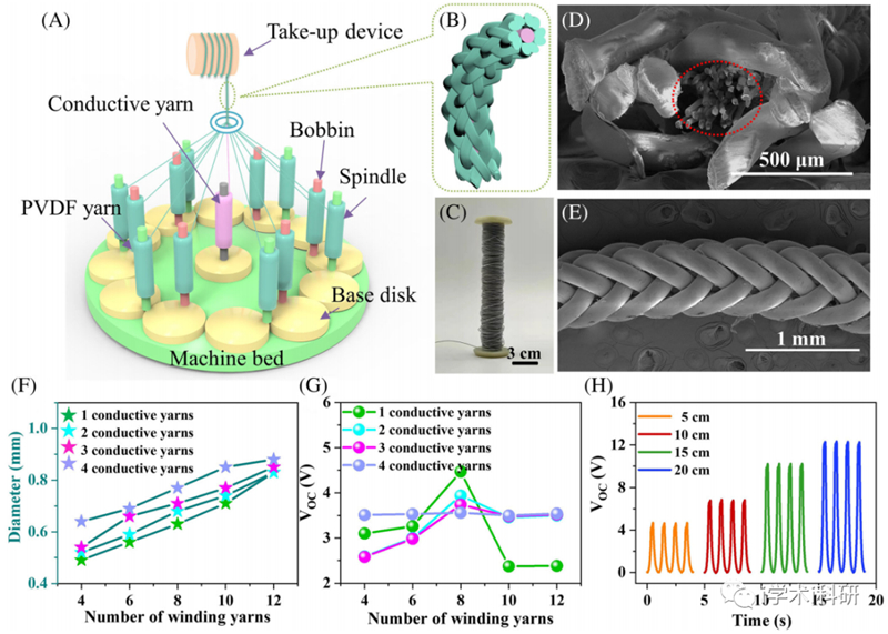 1. 报告了一种大规模制造芯壳型摩擦电编织纤维的方法。通过将聚偏二氟乙烯(PVDF)纱线编织在涂银的尼龙纱线上,制备出厚度均匀、长度连续的编织纤维。2. 这种芯壳式摩擦电编织纤维可以进一步扩展到基于不同织物成型技术的动力纺织品,如编织和针织,以实现能量收集和自供电传感功能。