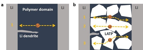 锂离子在聚合物固态电解质以及复合固态电解质的传输路径示意图