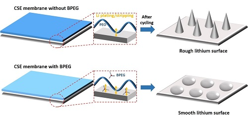 潘锋教授课题组在复合固态电解质及界面调控方面的研究取得重要进展。通过将无机的固态电解质(Li.3Al0.3Ti1.7(PO4)3)、有机的聚氧乙烯(PEO)和硼化聚乙二醇(BPEG)以7:1.5:1.5的比例混合,制备得到了无机有机复合固态电解质(CSE-B-71515)。三个组分在其中各司其职,无机固态电解质提供了锂离子的通道,还能使得复合固态电解质具有较高的机械强度;有机大分子PEO不但能够传导锂离子,还起到了粘合陶瓷颗粒的作用;而有机小分子BPEG首先使PEO的结晶度降低,其次将固-固界面之间的硬接触变为了软接触,从而能够使得锂在金属锂上的沉积和脱出更加均匀。通过具有以上特性,该电解质能够很好地在物理上和化学上阻挡锂枝晶的产生。此外,60摄氏度下将固态电池的磷酸铁锂与金属锂分别作为正负极对该复合固态电解质进行电化学测试,0.1C的倍率下取得了158mA h g-1的比容量,2C的倍率下取得了94mA h g-1的比容量。该研究对于固态电解质的研究具有重要的指导价值。
