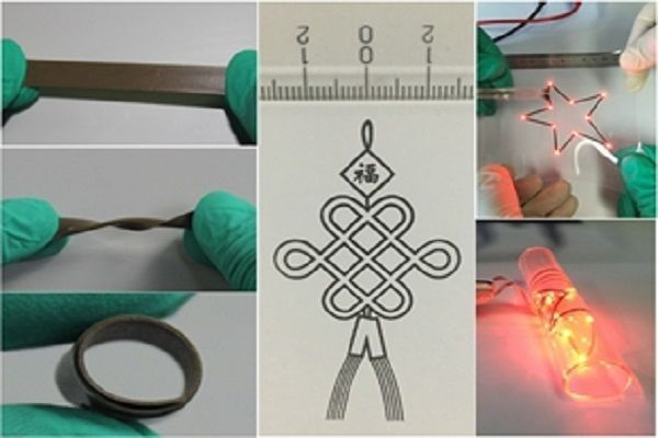 图:导电复合材料的机械柔性与可印刷性演示及其在柔性印刷电路与对人体运动行为监测领域的应用。