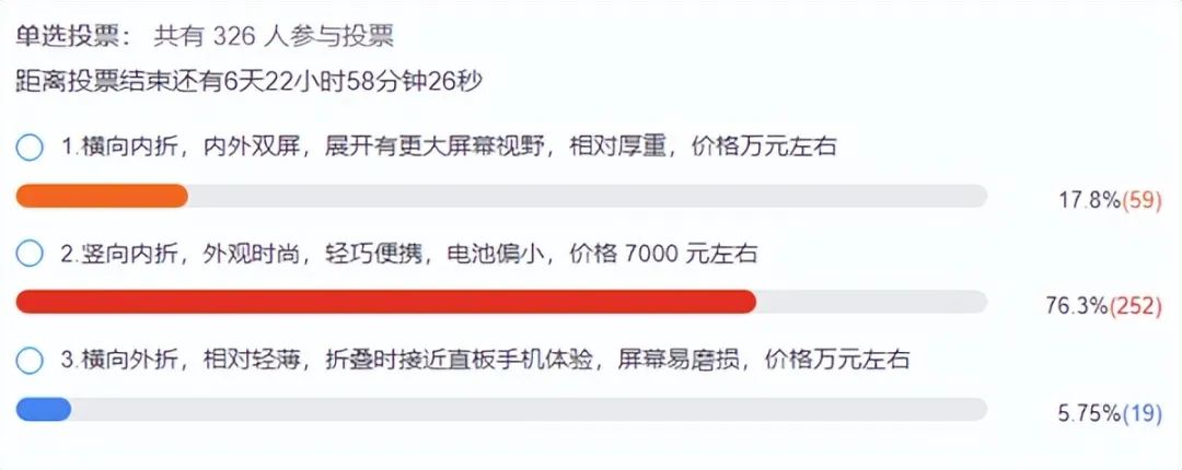截至目前,参与投票的326名“煤油”中,有76.3%都选择了价格相对更低,并且轻巧时尚的竖向外折设计,而容易损伤屏幕的横向外折得票最少,仅有5.75%。