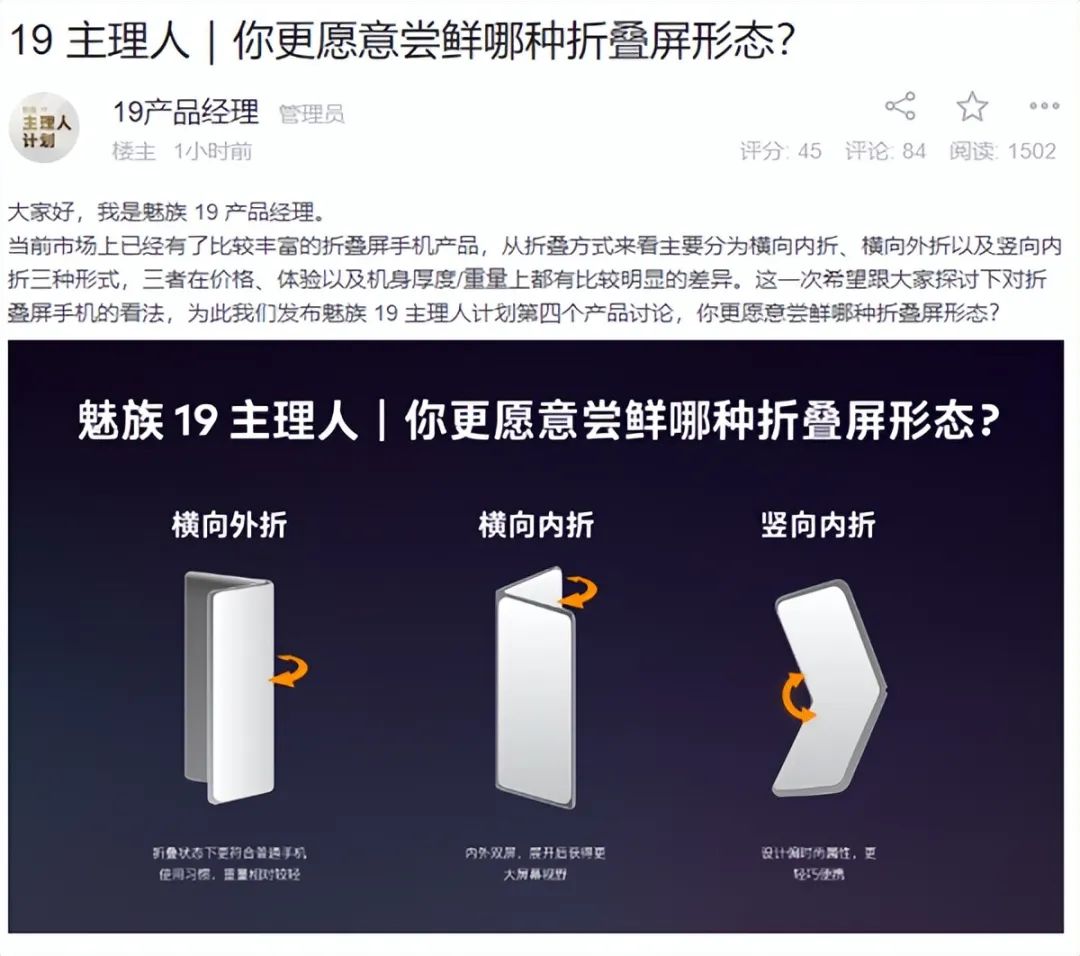 今天,魅族19产品经理在官方社区发布了“19主理人”计划的第四项讨论,出乎预料的是,这次讨论的焦点放在了折叠屏上。