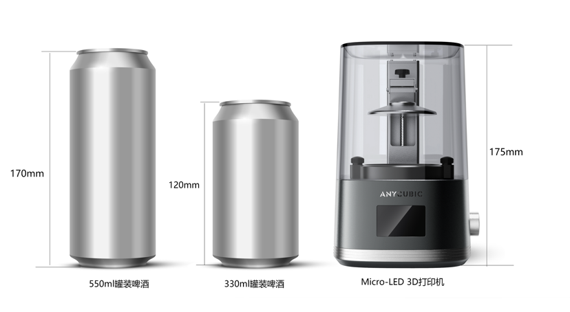 首款Micro LED3D打印机和罐装啤酒的对比图