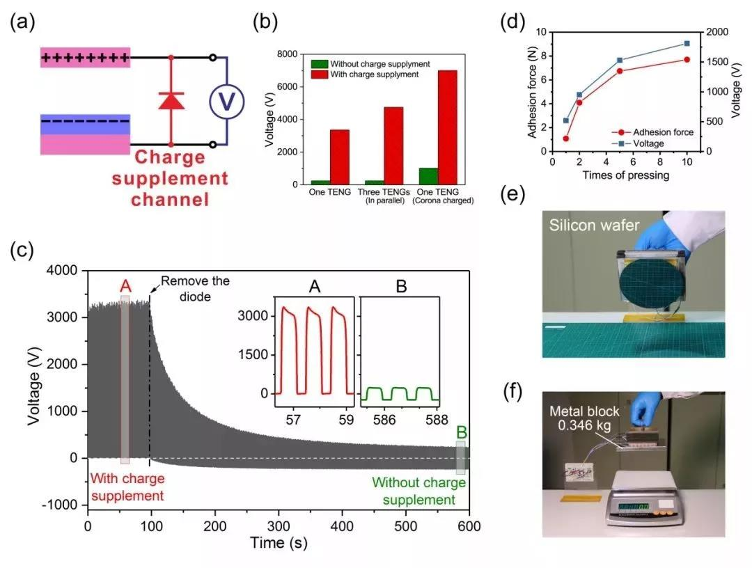 (a)电荷补偿通道示意图;(b)不同TENG器件的电压增强效果;(c)电荷补偿对TENG单元开路电压影响的比较;(d)自驱动静电吸附系统在不同的按压次数下实现的电压和吸附力;(e,f)自驱动静电吸附系统对硅片及重物实现吸附及操纵。