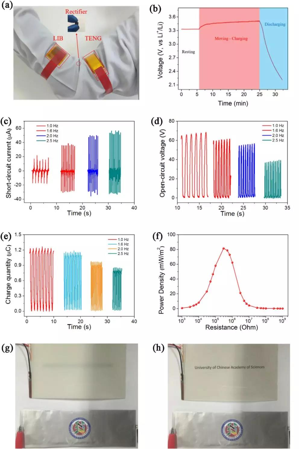 图3 (a) 由柔性电池和柔性摩擦纳米发电机组成的可穿戴式自充电系统;(b) 柔性LIB的充/放电曲线; (c) 在不同冲击频率下柔性摩擦纳米发电机的短路电流;(d) 在不同冲击频率下柔性摩擦纳米发电机的开路电压;(e) 在不同冲击频率下柔性摩擦纳米发电机的充电量;(f) 输出功率密度与不同外部负载电阻的关系;(g,h) 为柔性电致变色膜供电的柔性电池的照片
