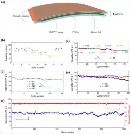 图2 (a) 柔性LIB电池的示意图; (b) 柔性电池的倍率性能; (c) 0.5 C下弯折不同次数的电池循环性能; (d) 0.5 C下弯折不同角度电池的循环性能; (e) 0.5 C下两种不同变形状态下电池循环性能的比较; (f) 0.5C下平坦状态电池的循环性能。