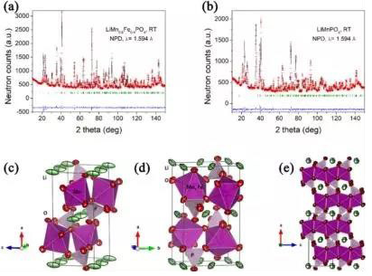 图1 (a)样品LMFP的NPD图谱; (b)样品LMP的NPD图谱; (c)LMP的晶体结构; (d)LMFP的晶体结构; (e)LMFP的晶体结构图(Li离子扩散沿[010]方向的通道)。
