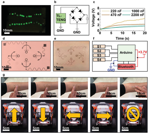 通过点亮LED灯以及为电容器充电,作者证明了TL-TENG能将收集的机械能有效转化为电能的能力。于是,作者进一步将TL-TENG应用于人机界面中的控制系统。箭头状的TL-TENG被设计和用于小型电动汽车的遥控器,用户可以点击相应的箭头来控制遥控车。以Arduino作为微控制器,通过蓝牙发送指令,用户可以无线控制遥控电动车,只需在手臂上点击箭头的不同方向,就可实现驱动遥控车向相应的方向移动。这结果表明,TL-TENG可以响应手指的按压,从而构成了一个简单的控制系统。因此,这种TL-TENG在能量收集和人机界面等应用上展示了巨大的潜力,为精致的可穿戴电子产品提供了一种新的途径。