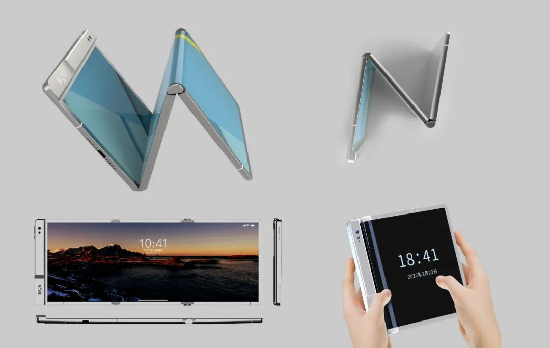京东方f-OLED柔性“N”形折叠显示原型机,搭载原尺寸为12.3英寸的柔性AMOLED显示屏,经历一次外折折叠后可变为8.6英寸大小,再经历一次内折折叠后可变为5.6英寸的超级便携形态。