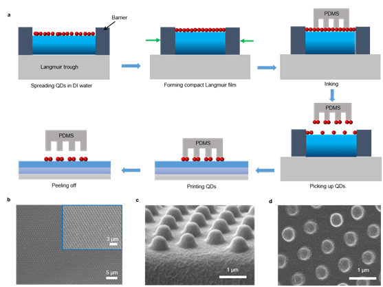 实现了量子点图案化薄膜的均匀拾取和释放,可以轻松制备出亚微米级像素的超高分辨率量子点发光二极管。重要的是,这是有史以来报告的显示器件的最高像素密度之一。