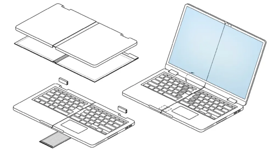 从图可知,三星设计的可折叠设备有两个主要部件:屏幕和键盘底座。除了可折叠的显示屏之外,它有设计有一个能够分成两半的键盘底座。该设备的上半部分,即可折叠显示屏,在展开时有一个传统的长宽比,并通过几个铰链与下半部分连接。