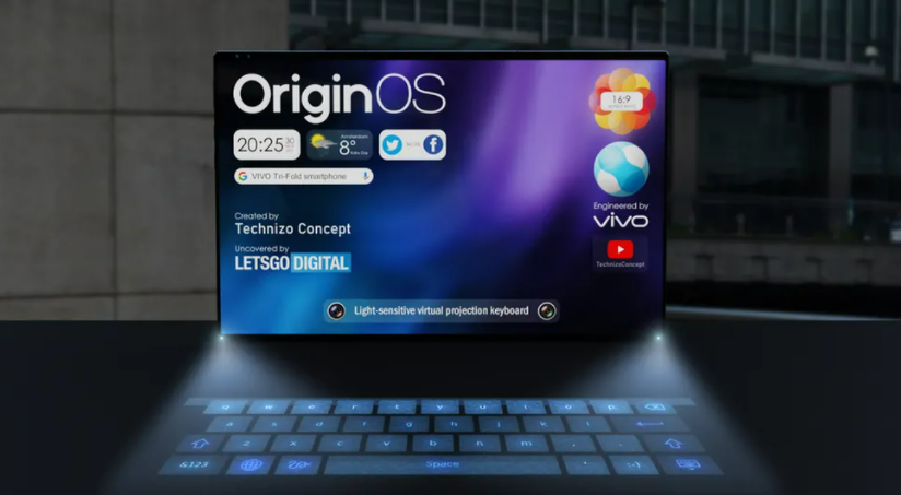 上面专利图及渲染图所示意的是,vivo正在研发的带光敏投影虚拟键盘的双折式智能设备。其最大特点是无铰链的双折屏,根据专利文件显示该机型提到了一个伸缩系统,负责管理折叠过程,这个系统取代了铰链,而伸缩系统可放置在套管的顶部和底部。此外,这款折叠屏设备的屏幕展开为8英寸屏幕并配有虚拟键盘,可实现平板电脑的使用模式。