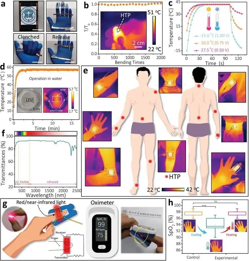 得益于合理的结构设计和材料选择,柔性透明热疗片显示出了优异的稳定性。热疗片可以适应各种严苛使用条件,例如可在弯曲、揉捏、高低温甚至水下正常工作,且性能无明显变化,方便患者在不同环境中使用,例如洗澡和游泳。柔性透明热疗片从紫外到远红外的宽光学透过谱赋予了其与其他检测设备在线联用的功能,例如在加热手指时进行血氧检测,以降低因低温引起的血氧测试结果误差。