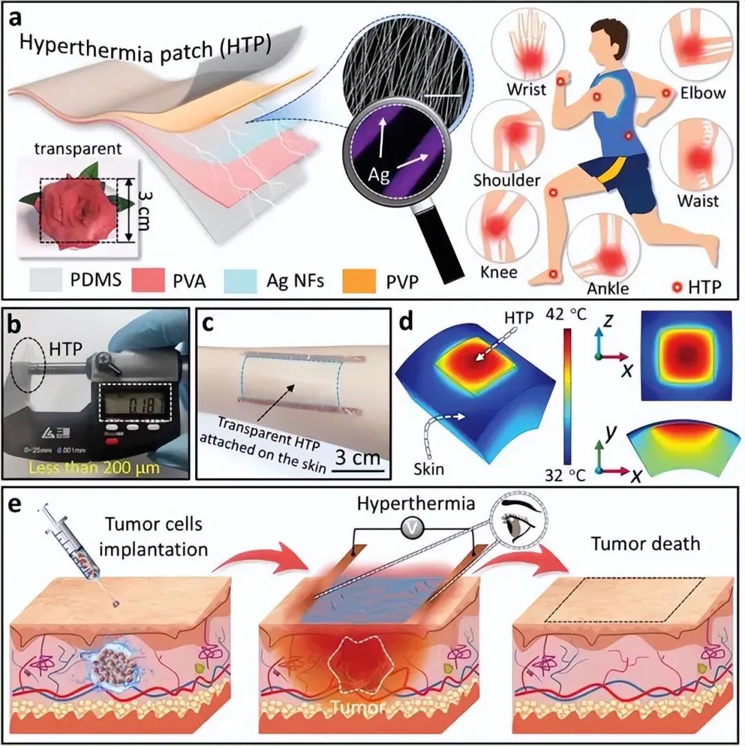 研究人员以超长定向排列银纳米纤维网络为焦耳热发生器,并用多种高分子材料将其固定、封装,组装成柔性透明热疗片。热疗片可完美贴敷于人体关节部位缓解各种慢性疾病或贴敷于肿瘤部位对皮下肿瘤进行热疗。由于其高透明性,可在热疗时对局部皮肤状态进行实时观察、连续跟踪,防止皮肤灼伤。